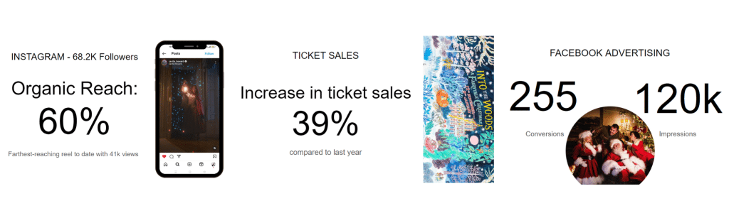 The Christmas at Castle Howard video marketing campaign achieved remarkable success. Ticket sales soared by 39% compared to the previous year. On Instagram, the campaign reached an impressive 60% organic audience, with the top-performing reel garnering 41k views. YouTube saw the campaign’s video becoming the most popular in six months, boasting an 80% average view time. The campaign’s excellence was recognised with the prestigious Museum + Heritage Awards’ “Marketing and Communications Campaign of the Year for Christmas at Castle Howard”
